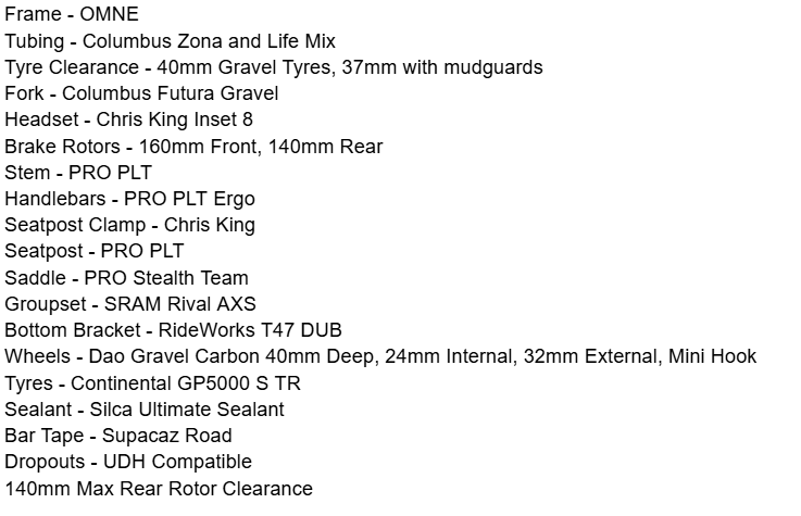 The build includes a Columbus Futura All Road fork, Pro Discover alloy cockpit, Pro PLT seatpost and stem, and 32mm Continental GP5000 STR tires set up tubeless on DAO Gravel 40 wheels. As with all our OMNE’s it is finished with a Chris King headset, seatpost clamp and RideWorks T47 bottom bracket.