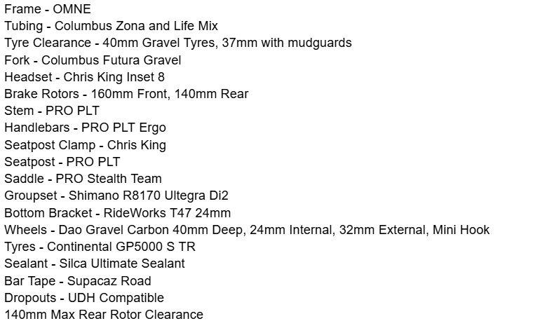 The build features a Columbus Futura All Road fork, Pro Discover alloy cockpit, and Pro PLT seatpost and stem, plus 32mm Continental GP5000 STR tires set up tubeless on DAO Gravel 40 wheels. As with all OMNE models, it’s finished with a matching Chris King Inset 8 headset, seatpost clamp and a RideWorks T47 bottom bracket.